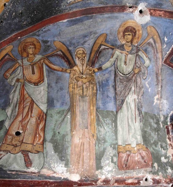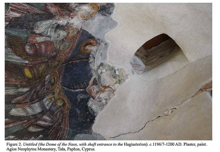 But Neophytos was a kooky guy, and he decided to portray himself in his wall paintings as already a Saint. That included a depiction of him seemingly being lifted up into heaven by angels, the cross of their wings at his back almost resembling a pair of wings for himself, and a notably odd architectural feature within the cave monastery itself.