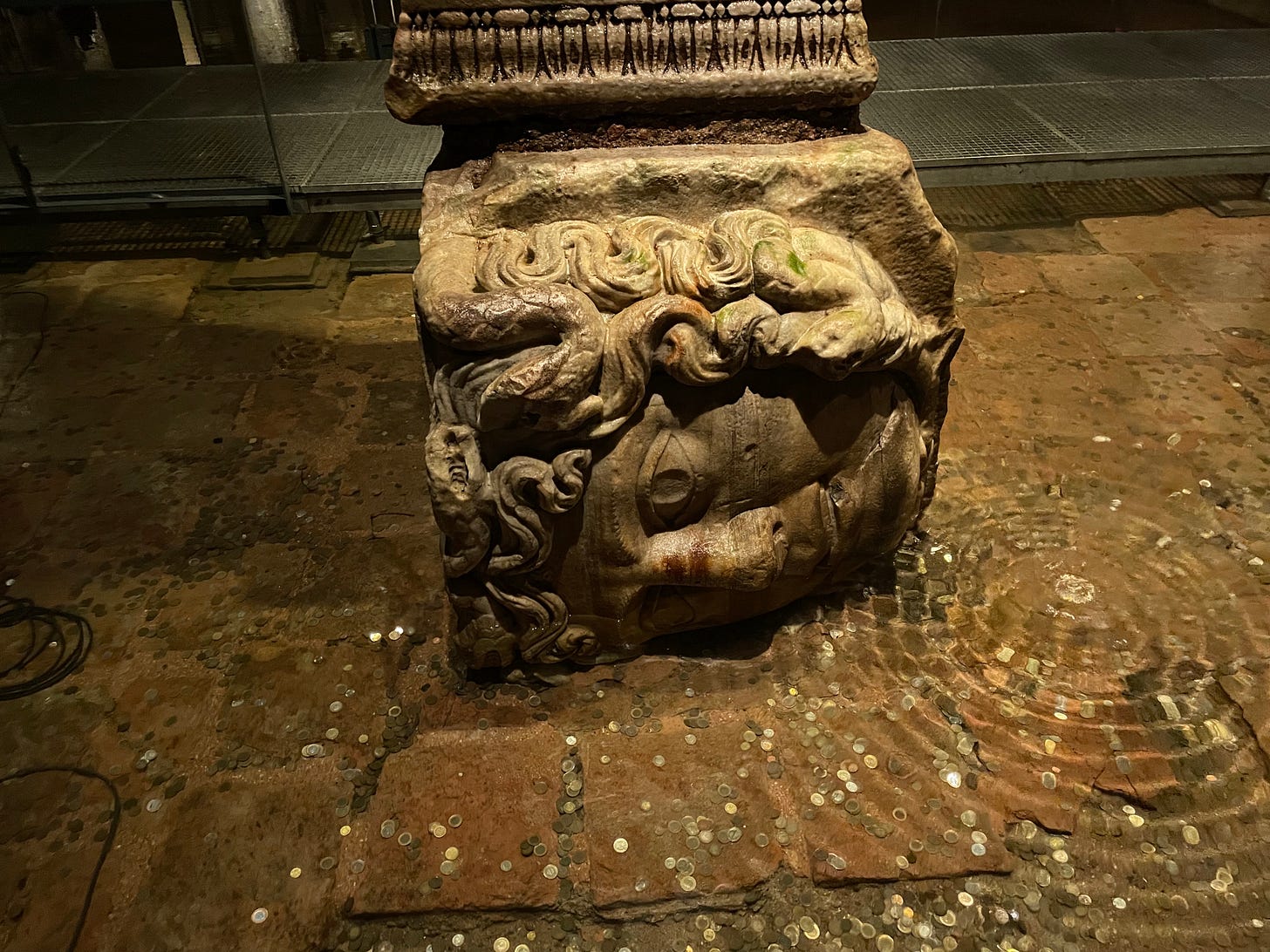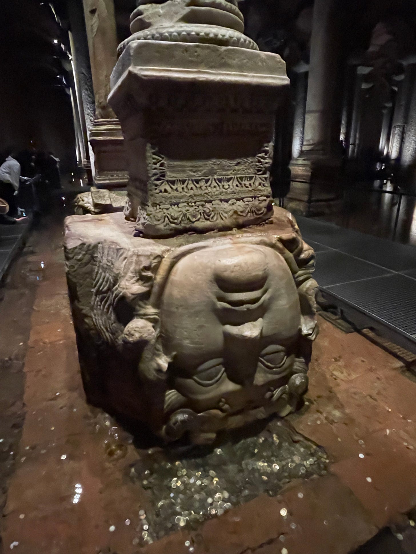Lo and behold, someone at some point stumbled upon two massive heads of the Gorgon Medusa, and decided that these blocks would make the perfect foundation stones of two of the marble columns in the cistern. Curiously, however, they chose to turn them sideways and upside down, rather than turning them upright.