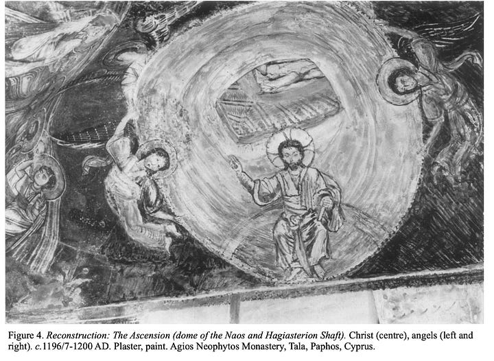 How did Neophytos make sure his monks could never quite tell if they were being watched or not? Well, he had some wall paintings done on the dome’s ceiling, too. The iconography was pretty standard — Christ ascending into heaven. Except for the fact that Neophytos had Christ painted so that his head and neck went up into the shaft leading up to his cell. Which meant that, if a monk was to look up and catch a glimpse of Neophytos looking down at him, it would appear as though Neophytos’ head was upon Christ’s body — no doubt, giving the monk a real fright for a moment, when ‘Christ’ actually moved and blinked as he observed him!